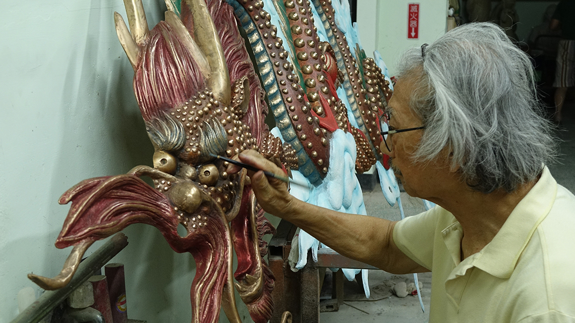 另外,「一開始我初步是用泥塑,因為它是浮雕,所以很薄,很容易乾掉,乾掉就必須拆掉、重新再來。現在我們改用另一個方法,一件一件先大體做好,再翻成塑鋼、裝上去,就不怕它乾掉。這是製作上的第一個挑戰。第二個挑戰是,一般銅雕上色時都把銅覆蓋掉了,而我想做的是到最後完成時都還能看出它本身是銅的材質。這方面我花了很多心力,一直在研究如何上色、如何讓銅的顏色顯現出來。」