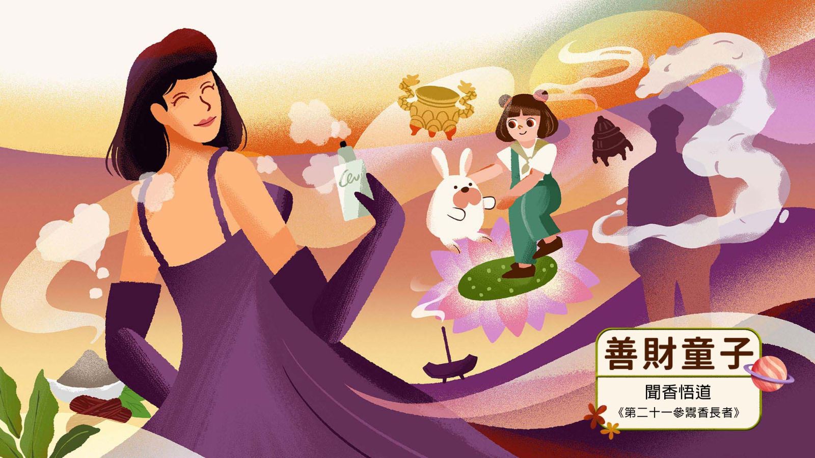 「善財!最後再跟你講一個奪意香,它的特色就是燃燒起來,天上會落下一切可以莊嚴佛堂道場的器物,我見了,就說菩薩六波羅蜜,也就是菩薩以六度萬行─布施、持戒、忍辱、精進、禪定、般若,接引人們從煩惱的娑婆世界,到達解脫的彼岸。」善財這才聽得意猶未盡,鬻香長者已經在做總結:「好啦,善財,我已經把我所知道關於香的事,全都告訴你了,你有什麼心得沒有啊?」