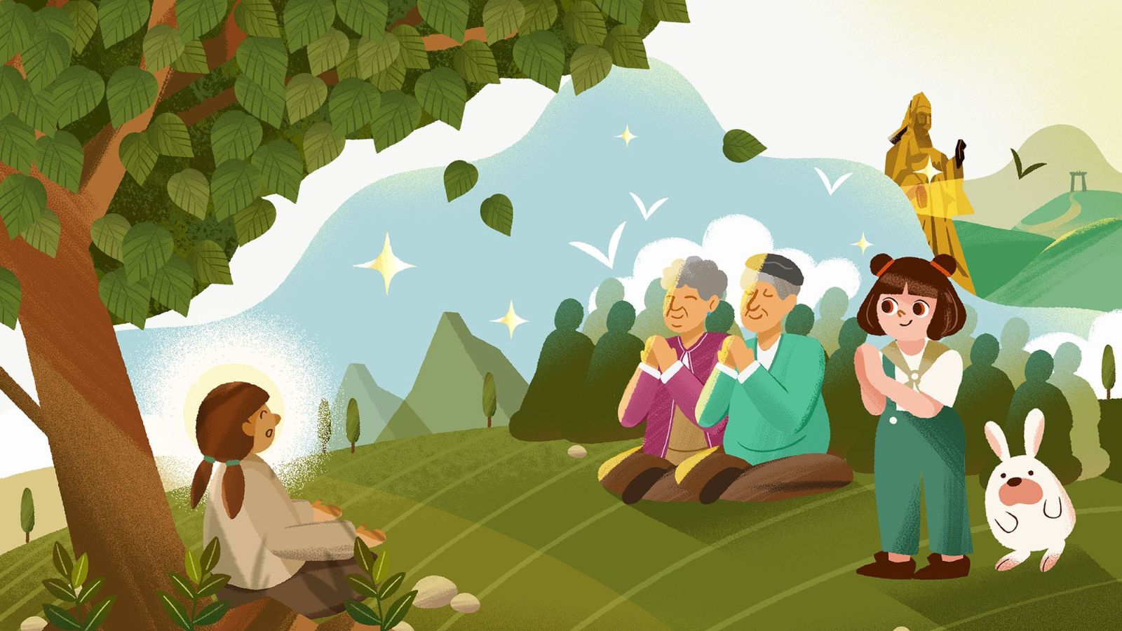來來來,小兔,你別再吃了啦!快快收拾書包,跟我一起去慈行童女的宮殿聽法吧!讓我們一起開開心心學佛,忘掉煩惱憂愁!